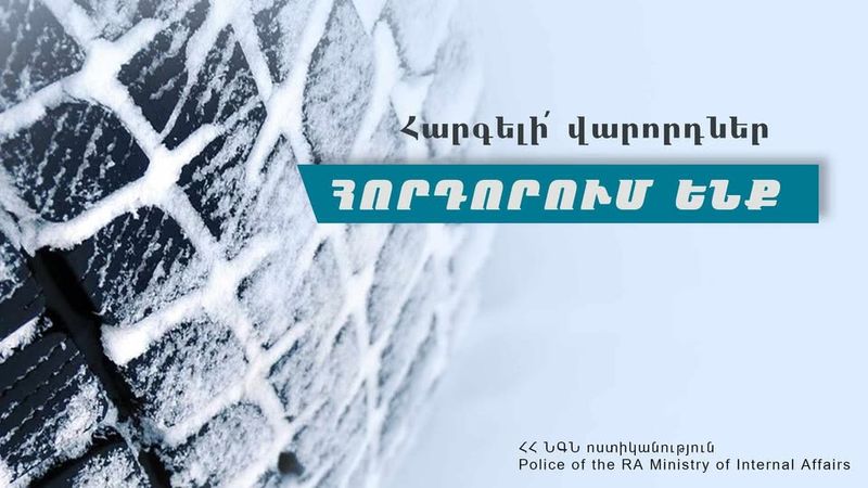 Բոլորիս անվտանգությունից ելնելով՝ հորդորում ենք երթևեկել բացառապես ձմեռային անվադողերով, խստորեն պահպանել ճանապարհային երթևեկության կանոնները: