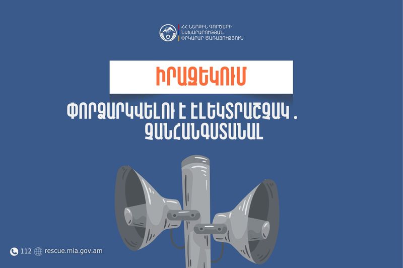 Մարտի 2-ին՝ ժամը 12:00-ից մինչև 13:00-ն ընկած ժամանակահատվածում, Շիրակի մարզի Անի համայնքի Ջրափի բնակավայրում փորձարկվելու է էլեկտրական շչակ։