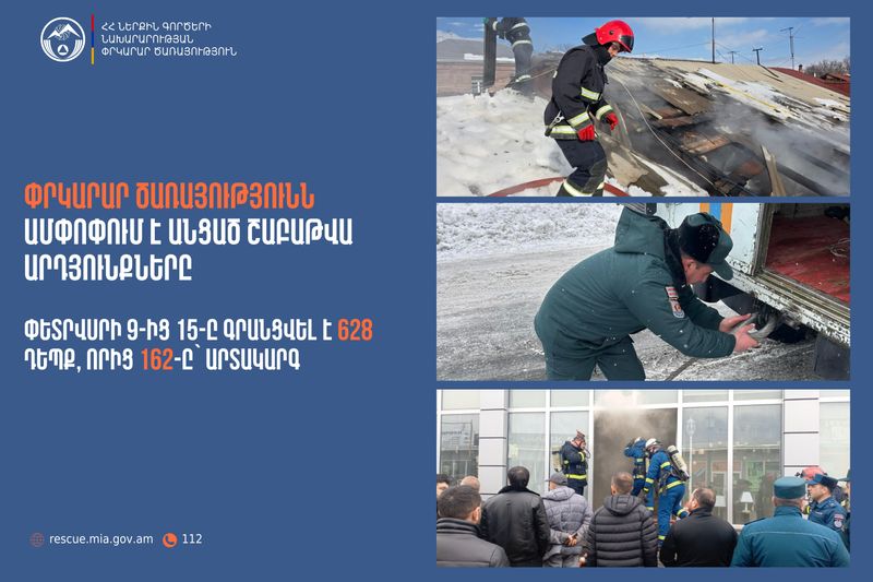 Փետրվարի 9-ից 15-ը ՆԳՆ ՓԾ ճգնաժամային կառավարման ազգային կենտրոնում գրանցվել է 628 դեպք, որից 162-ը՝ արտակարգ: