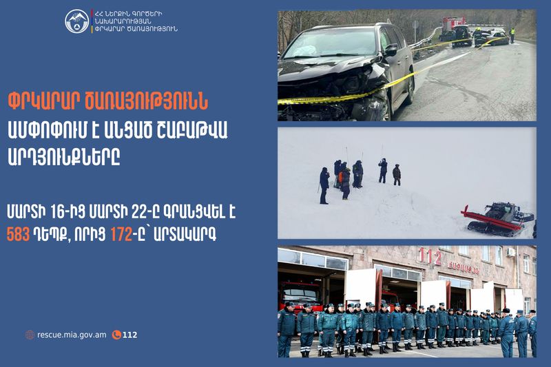 Մարտի 16-ից 22-ը ՆԳՆ 112 օպերատիվ կառավարման կենտրոնում գրանցվել է 583 դեպք, որից 172-ը՝ արտակարգ: