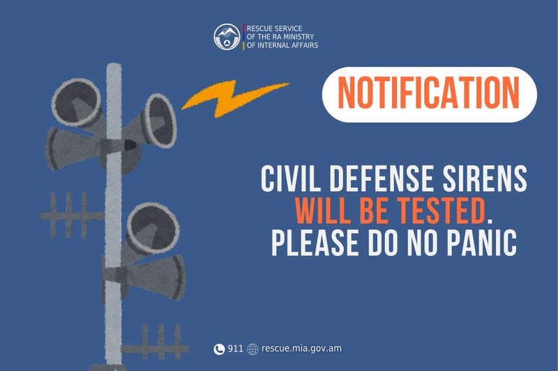 On September 19, civil defense sirens will be tested from 10:00 to 10:30 in Verin Sasnashen, from 11:00 to 11:30 in Agarakavan, as well as at 12:00 Tsilkar and Kosh settlements of Aragatsotn province.