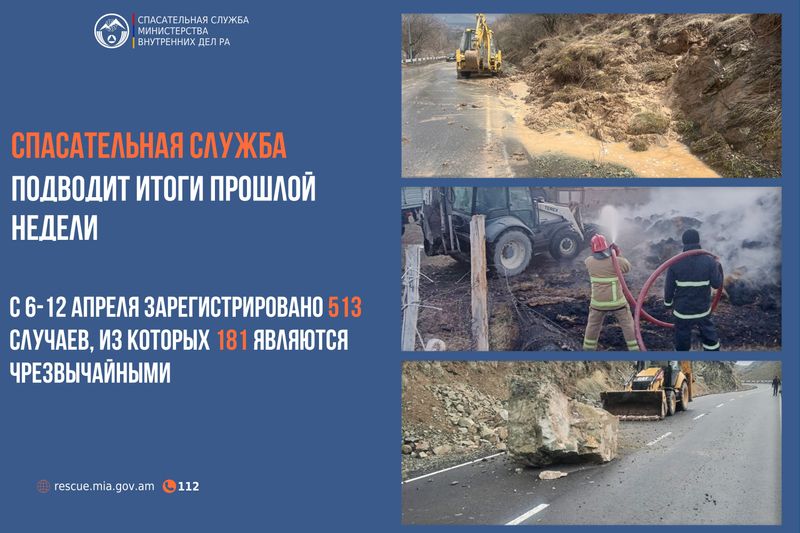 В частности, 104 пожара, по 1 случаю обрушения, взрыва, происшествия на железнодорожных путях, сильного ветра, метели, проливного дождя, землетрясения, обнаружения боеприпасов, 7 камнепадов, по 4 случая гололедицы, оползня, по 3 случая обильного снега и обнаружения змей, а также 3 несчастных случая, 5 отравлений, 6 ложных звонков, 14 попыток самоубийства, 46 дорожно-транспортных происшествий, а также 123 звонка по бытовым вопросам, 29 случаев риска возникновения пожара, 36 ложных звонков о пожаре и 118 других случаев.