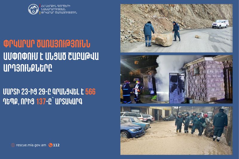 Մարտի 23-ից 29-ը ՆԳՆ 112 օպերատիվ կառավարման կենտրոնում գրանցվել է 566 դեպք, որից 137-ը՝ արտակարգ:
